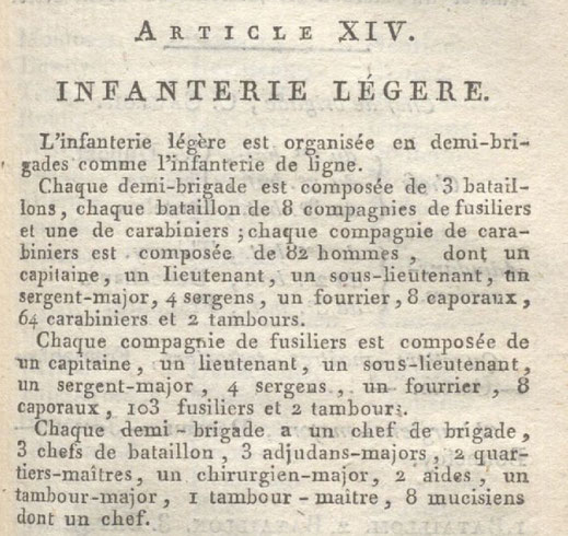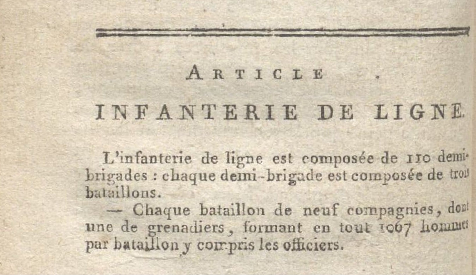 Le bataillon y était de 8 compagnies de 80 ou 85 hommes sur pied de guerre. En temps de paix, celles-ci n'étaient que de 40 hommes. Mais 2 bataillons n'en formaient qu'un seul, pour qu'à l'exercice, le front de bataille comptât toujours le même nombre de fusils qu'à la guerre ; les grenadiers étaient conservés dans l'intérieur de chaque compagnie.